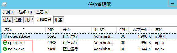 那么怎么知道自己的nginx是否啟動成功:打開你的管理器,如在進程中看到兩個nginx說明啟動成功