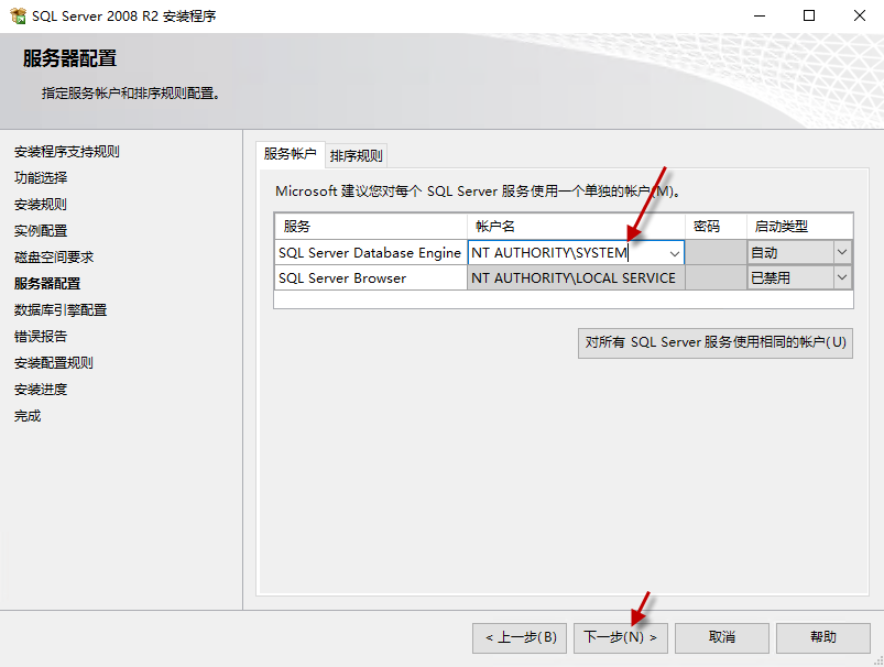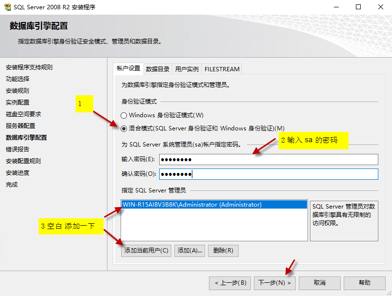 注意:身份認(rèn)證模式必須選擇 混合模式; 為sa 的賬號(hào)輸入密碼,后面安裝的軟件的時(shí)候會(huì)用到